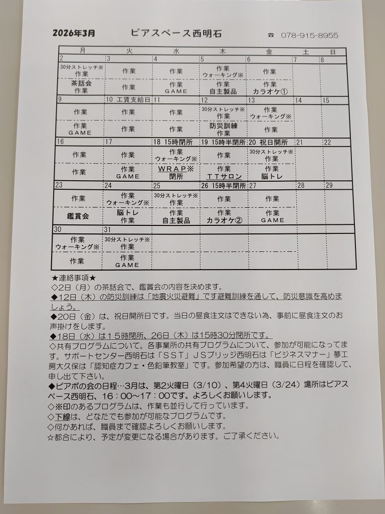 ☆ピアスペース西明石3月予定表☆ 2026年3月3日 最終更新日時 : 2026年3月3日 NPO法人居場所 こんにちは⭐ピアスペース西明石です😊 遅くなりましたが3月の予定表です👀少しずつ暖かくなってきてウォーキング日和になってきましたね⭐まだまだ寒暖差もありますので体調管理しっかりして無理なく頑張りましょう✨