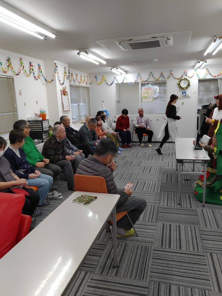 毎年ずっとクリスマス会はカレーだったんですが今年は気分を変えて、クリームシチューとピザとフライドポテト&ナゲット、食後にケーキを頂きました☆どれも美味しくて好評でした😊食事を終えて、ゲストの方によるプログラムのパントマイムは、カースケ町田さん、水田理事による手品🪄が始まりました✨パントマイムはいつ見ても細やかで芸術的✨手品は、終わった後に皆が眠れなかったら困る…との思いを汲んで種を明かしてくれる親切な水田理事😆その後、職員とピアノ演奏と歌でとても盛り上がりました⭐